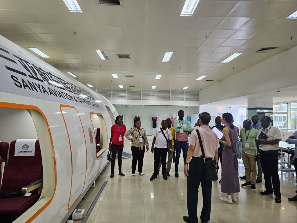 座谈交流环节,岳军副校长代表学校对培训班一行的到来表示热烈欢迎,期待以此次访问为契机,深化彼此在民航领域的合作,携手推动中布两国民航事业高质量发展。接着,海南省商务厅项目经办人童元阳致辞,对学校精心筹备此次交流活动表示诚挚感谢,希望参训学员充分借助本次交流活动学有所获、满载而归。随后,乘务学院副院长赵晓硕详细介绍了学校的办学成果及航空类人才培养方面的突出优势。