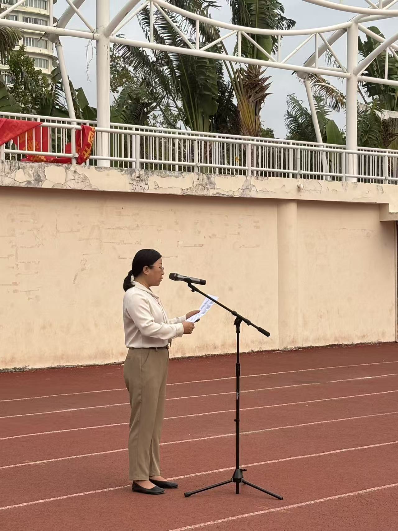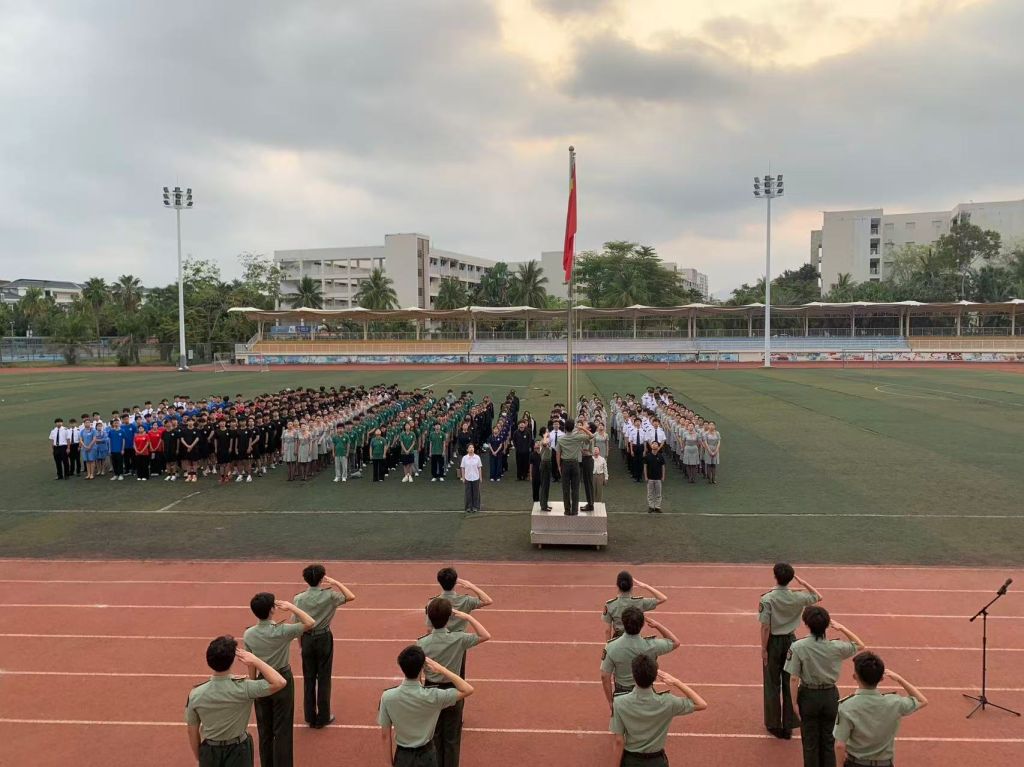 清晨,仪式在庄重肃穆的氛围中开始。国旗护卫队队员精神抖擞、步伐铿锵,护送五星红旗走向升旗台。伴随着雄壮嘹亮的中华人民共和国国歌,鲜艳的五星红旗冉冉升起、迎风飘扬。全体师生整齐列队、肃立注目,高唱国歌,表达对祖国的无限热爱和对革命先烈的崇高敬意。