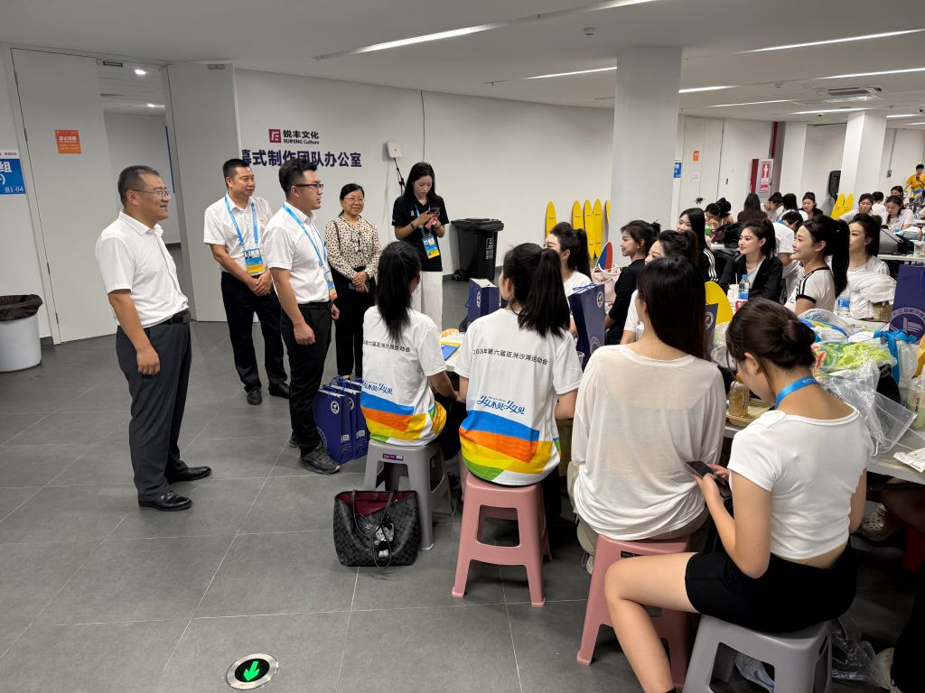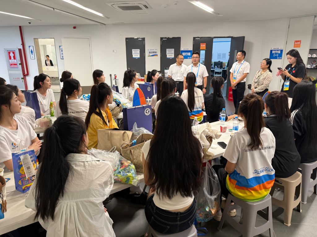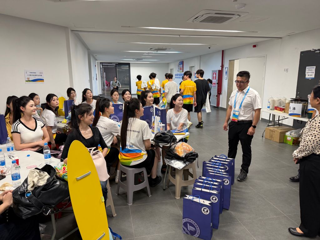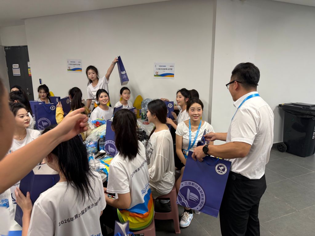 王利助理对全体志愿者不畏辛劳、精益求精的备战表现给予高度肯定。他表示,亚沙会是亚洲瞩目的体育盛事,闭幕式引导岗位意义特殊、责任重大,志愿者的一言一行,不仅是个人素养的展现,更是学校育人成果、办学风貌的直观窗口。他勉励全体志愿者,珍惜本次国家级赛事实践机会,在最后的冲刺阶段凝心聚力、团结协作,持续调整最佳身心状态,打磨专业技能、严守服务标准,以饱满的热情、专业的姿态圆满完成闭幕式引导任务,用青春力量助力亚沙盛会圆满落幕,为学校增光添彩。随后,校领导一行向全体引导员志愿者送上精心准备的慰问品,转达了学校党委和校领导对大家的关心与问候。