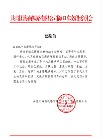 近日,三亚航空旅游职业学院乘务学院志愿者协会荣获“全国铁路优秀志愿者组织”荣誉称号!这是对学院志愿工作的充分肯定,更是属于每一位志愿者的荣光!